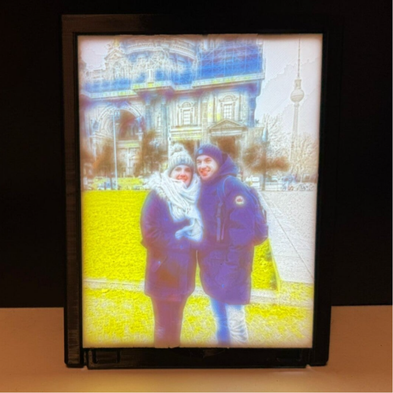Het is mogelijk om een 3D fotolijst te maken. De kleur is te zien door het led paneel aan te zetten, naast de elektronica is alles geprint, inclusief de lijst zelf. Het fotolijstje kan horizontaal en verticaal geplaatst worden. De voeding naar het led paneel gaat via een usb c kabel.